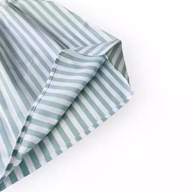 En nydelig stripe mønstret kjole med rett hals. korte ermer med volanger og lettutsvingt skjørt. Søt sløyfe bak som